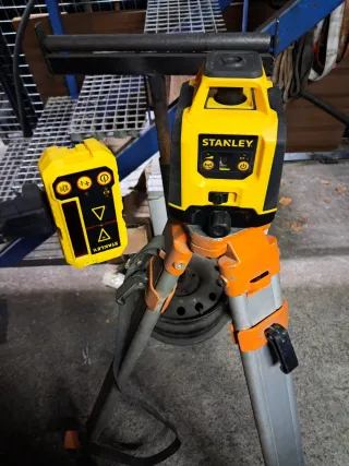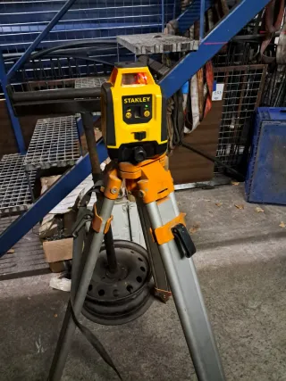 Nivel láser rotativo de la marca Stanley, ideal para trabajos de construcción y medición. - Diseño robusto y compacto. - Incluye trípode ajustable.