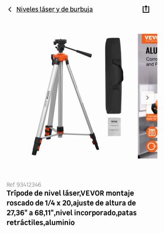 Trípode de nivel láser VEVOR de aluminio. Cuenta con montaje roscado de 1/4 x 20 y patas retráctiles. - Ajuste de altura de 27,36 a 68,11. - Nivel incorporado. - Material: Aluminio. últimas 2 unidades