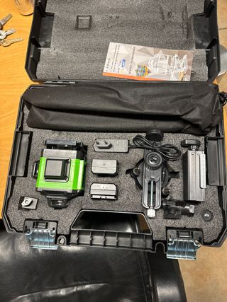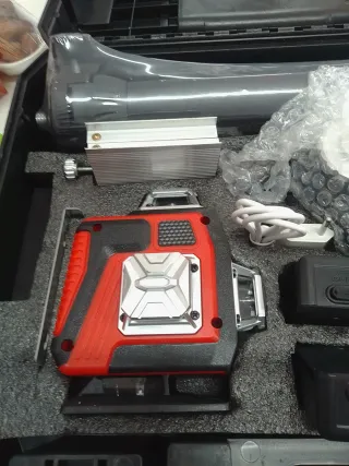 Nivel láser profesional de 360 grados con accesorios. - Incluye trípode. - Mando a distancia. - Baterías recargables. - Bolsa de transporte.
