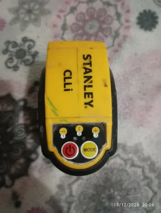 Nivel láser de la marca Stanley. - Color amarillo y negro. - Botones de control en la parte frontal. - Solo funciona la luz Vertical ( Plomo)