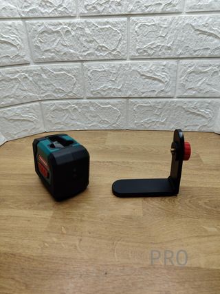 Nivel láser de color amarillo y negro, con un soporte de pinza. - Nivel láser. - Soporte de pinza - falta tapa