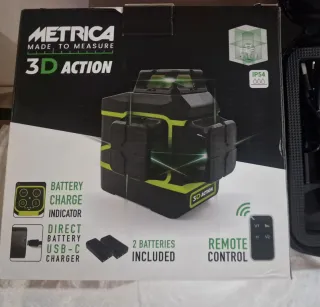 Nivel láser Metrica 3D Action en color verde completo con todos sus accesorios. - Indicador de carga de batería. - Carga directa de batería USB-C. - Incluye 2 baterías. - Control remoto. - tripode de sujeción. - detector de líneas para exterior. - bolsa y maleta de transporte. - IP54. - Precio en tienda del lote de +450€