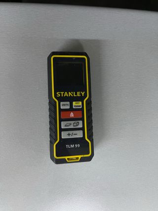 Medidor láser de la marca Stanley, modelo TLM 99. Dispositivo compacto y fácil de usar. - Pantalla digital. - Botones de control para unidades, ON/OFF, +/- y modo de medición. - Diseño robusto con detalles en amarillo y negro.