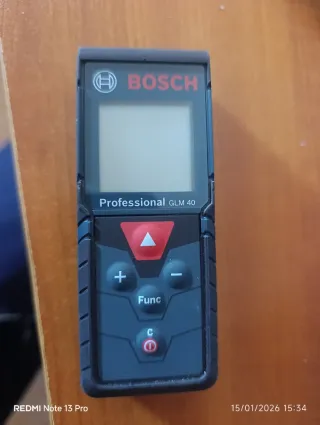 No se hace envío entrega en mano en Alicante o alrededores Medidor láser de distancias Bosch GLM 40 Professional. Sirve para medir longitudes, áreas y volúmenes con facilidad. Alcance de hasta 40 metros. Precisión de medición de \(\pm 1,5\) mm. Función de memoria que almacena las últimas 10 mediciones. Pantalla retroiluminada de tres líneas para una mejor lectura.