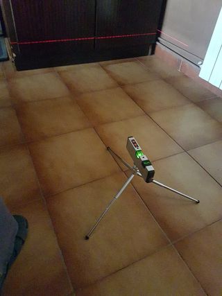 Nivel láser para mediciones precisas. - Proyecta líneas láser horizontales y verticales. - Base con trípode integrado.