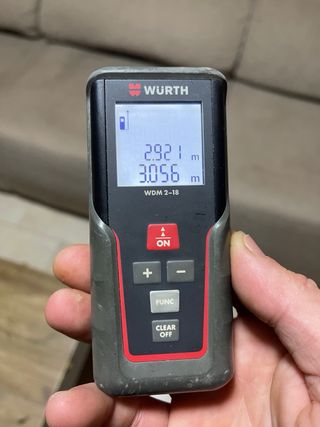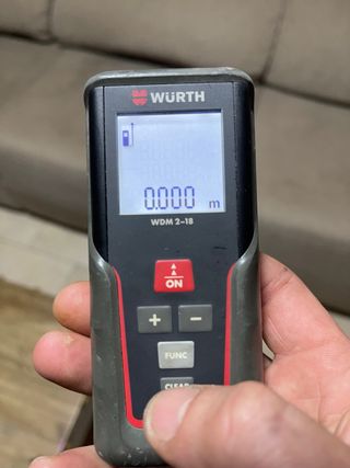Medidor láser de la marca Würth, modelo WDM 2-18. Compacto y fácil de usar. - Pantalla digital. - Botón ON/OFF. - Botones de función (+, -, FUNC, CLEAR).