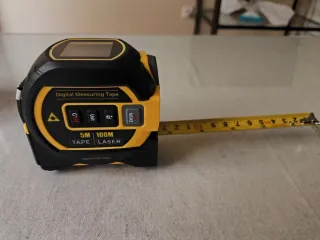 Flexómetro digital con función de medición láser. Combina la cinta métrica tradicional con tecnología láser para mayor versatilidad. - Cinta métrica de 5 metros. - Medición láser de hasta 100 metros. - Pantalla digital. - Botones de función (ON/OFF, Unit, MEAS). - Diseño multifunción.