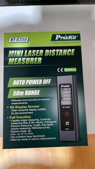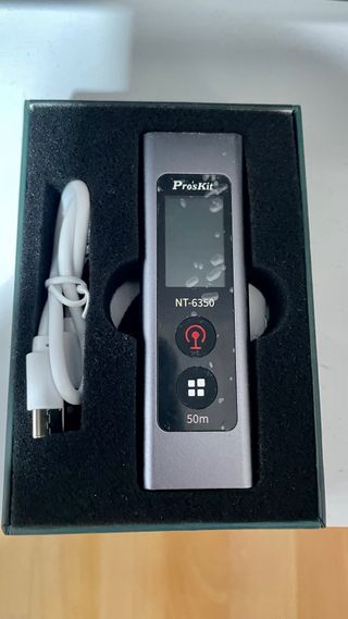 Medidor de distancia láser Pro'sKit NT-6350. Compacto y fácil de usar. - Rango de medición de hasta 50m. - Cable de carga USB incluido. - Diseño portátil.