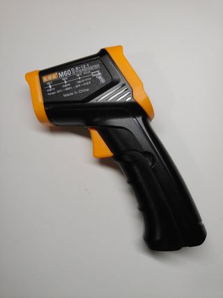 Pistola de temperatura con gatillo y puntero láser. Funciona con pilas (incluidas). - Rango de medición: -50°C a 600°C. - Pantalla digital. - Botón para seleccionar °C/°F - Botón para activar/desactivar laser - Pantalla iluminada