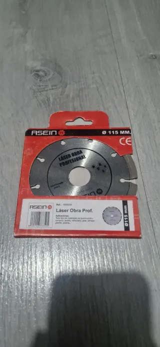 Disco de corte para obra profesional de la marca ASEIN. - Diámetro: 115 mm. - Modelo: Láser Obra Prof. - Referencia: 1500025 - Aplicaciones: Todo tipo de materiales de construcción (cemento, ladrillo, refractario, gres, terrazo, granito, pizarra). 7 unidades disponibles