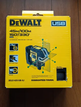 Nivel láser recargable DeWalt DCLE14251GB-XJ con línea de cruz verde y 5 puntos. - Alcance hasta 100m con dertector. - Precisión de ±3mm a 10m. - Resistencia al agua y polvo IP65. - Incluye estuche de transporte. - Autonomía de 11 horas. -Carga el 80% en 30 minutos. Nuevo a estrenar.