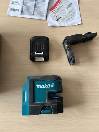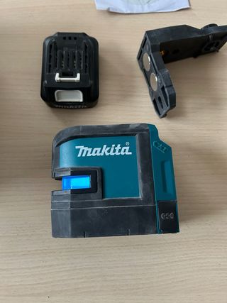 Nivel láser de la marca Makita. Incluye soporte magnético y batería. - Nivel láser. - Soporte magnético. - Batería. - Linea de color rojo