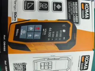 Metro láser Koma Tools con alcance de hasta 50 metros. Ideal para mediciones precisas. - Pantalla digital. - Botón de encendido/apagado y borrado. - Botón de medición. - Botón para cambio de unidades.