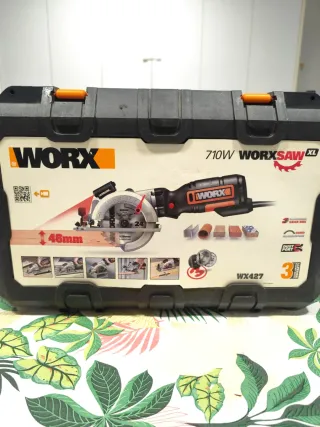 Sierra circular Worx modelo WX427 con motor de 710W. Incluye maletín. - Capacidad de corte de 46mm. - Disco de 120mm con 24 dientes. - Incluye guía láser. - Sistema de extracción de polvo. - Guardas de aluminio.