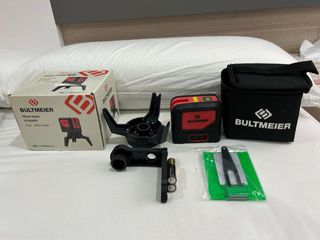 Nivel láser cruzado BULTMEIER, prácticamente nuevo. Incluye: - 1 nivel láser. - 1 trípode. - 1 soporte. - 2 pilas AA. - 1 estuche. - 1 tarjeta de garantía.