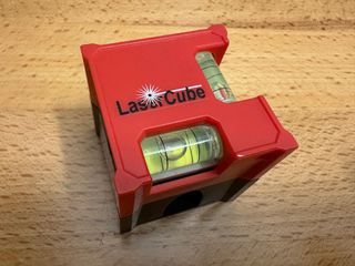 Nivel láser compacto de color rojo y negro. - Diseño cúbico. - Incorpora dos burbujas de nivelación.