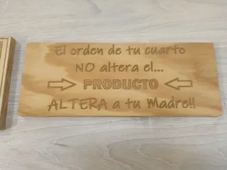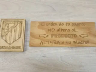 Dos carteles de madera grabados con láser. Uno con el escudo del Atlético de Madrid y el nombre. - Cartel escudo Atlético de Madrid. 12,5 x 9'5 cms - Cartel con frase divertida: El orden de tu cuarto NO altera el... PRODUCTO ALTERA a tu Madre!! 26 x 10 cms Solo se envía