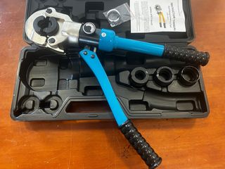 Herramienta profesional para la instalación de tuberías multicapa. Incluye la prensa y varios accesorios mordazas para crimpar. - Prensa hidráulica de fácil manejo. - Juego de mordazas de diferentes tamaños (16, 20, 25 y 32). - Maletín de transporte resistente. - Cabezal giratorio 360°. Herramienta fontanero fontanería albañil reforma construcción obra baño aseo plato ducha bañera lavabo cocina calefacción radiador caldera cobre multicapa bajante tubería pvc