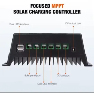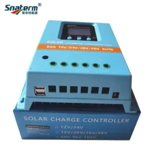 Regulador de carga solar MPPT de la marca Snaterm. - Capacidad de 60A. - Compatible con sistemas de 12V, 24V, 36V y 48V. - Pantalla LCD para visualización de datos. - Puertos USB para carga de dispositivos. - Diseño en color azul.