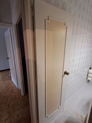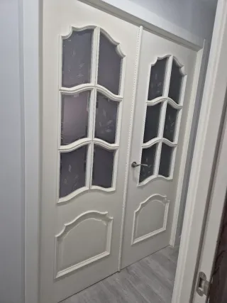 Se venden dos puertas macizas blancas para salón con un diseño elegante y cristal decorado con motivos vegetales. Medida: 72,5 cm la puerta fija y 72 cm la puerta de apertura hacia la derecha. Disponible una puerta maciza blanca con vidriera para cocina con apertura hacia derecha. Medida : 72.5 cm Disponible 1 puerta maciza blanca ciegas con apertura hacia derecha. Medida: 72.5 cm. Disponible 1 puerta maciza blanca con apertura hacia derecha. Medida: 62.5 cm. - NO incluye manillas, ni herrajes. - Precio unitario puertas ciegas: 30 eur. - Precio unitario puertas vidrieras: 50 eur. Pack completo: 190 eur.