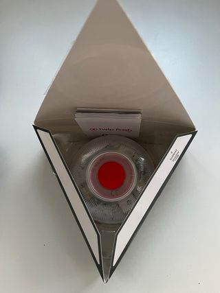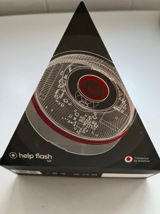 Dispositivo Help Flash IoT con conexión Vodafone. - Diseño triangular con detalles técnicos. - Logotipo de Help Flash IoT. - Conexión Vodafone.