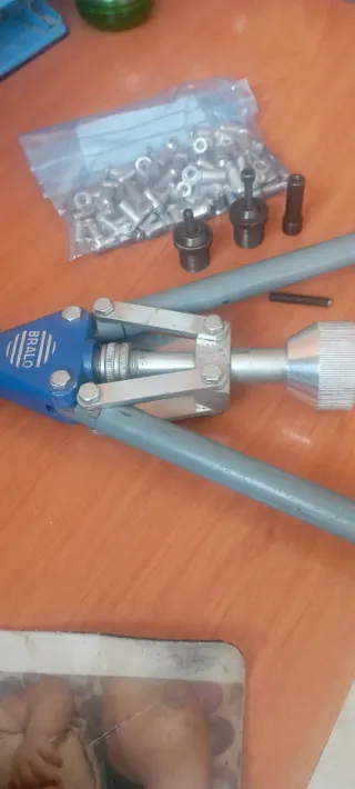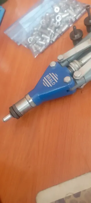 Herramienta para remachar tuercas de la marca Bralo. Incluye varios accesorios. - Cuerpo principal de color azul. - Mango ergonómico para un mejor agarre. - Incluye diferentes boquillas para distintos tamaños de tuerca.regalo tuercas