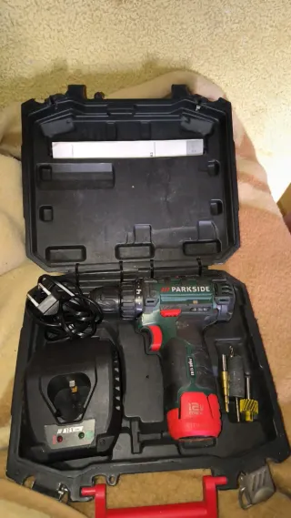 Taladro atornillador Parkside de 12V, ideal para trabajos en casa. Incluye su maletín original para guardarlo todo. - Taladro atornillador Parkside. - Cargador de batería. - Maletín de transporte. - Accesorios varios.
