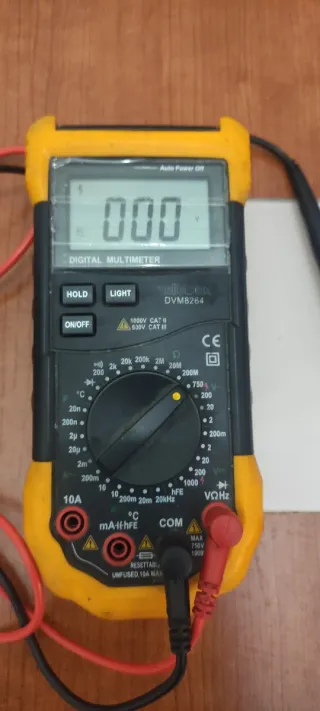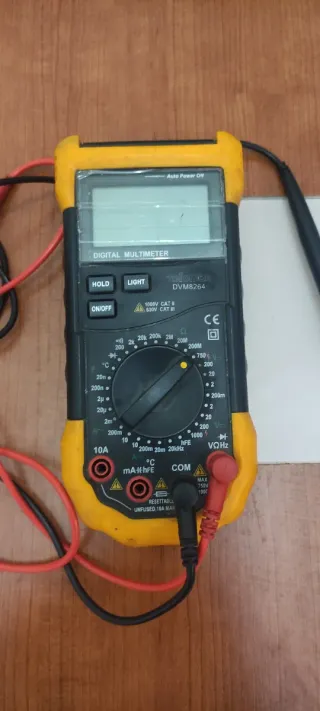 Multímetro digital Velleman DVM8264 en color amarillo y negro. Ideal para mediciones eléctricas. - Pantalla LCD. - Botones HOLD, LIGHT y ON/OFF. - Selector de funciones y rangos. - Puertos para sondas de medición. - Incluye cables de conexión. Este mide Capacitancia (condensadores), Frecuencia (Hz) y Temperatura (°C), además de lo habitual.