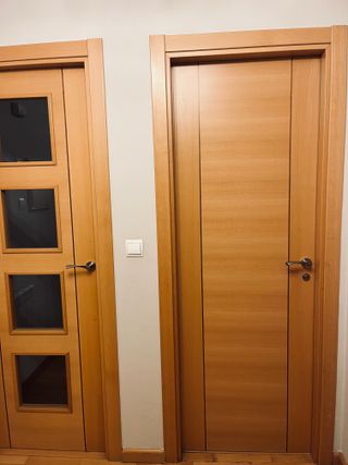 Vendo lote completo de 7 piezas: 6 puertas interiores estándar + 1 puerta doble, todas en estado impecable (como nuevas). Incluye hojas + marcos + tapetas + manillas/herrajes. Incluye: 4 puertas ciegas 70 x 202 cm 2 puertas con cristal 70 x 202 cm 1 puerta doble con cristales: hojas 70 + 43 cm, altura 202 cm Se puede ver sin compromiso. Prioridad a quien se lleve el lote. Recogida en mano (no envío por el tamaño).