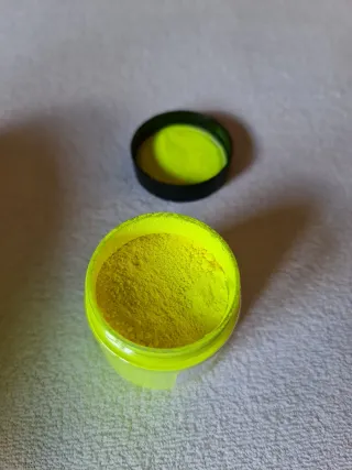 Tarro de pigmentos fluorescentes. - Color amarillo fluor Pigmento fluorescente diseñado para aplicaciones en las que se requiere un color fuerte y con brillo. Partículas muy finas y color uniforme. Beneficios y propiedades Excelente calidad de brillo y color Gran dispersión de las partículas El contenido de metales pesados cumple con la normativa EN 71-3 para juguetes. Aplicaciones Resinas Pinturas artísticas Propiedades físicas y químicas Tamaño medio de partícula menor o igual a 5 micrones Punto de reblandecimiento a partir de 120 ºC Punto de descomposición a partir de 200 ºC