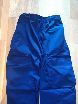 Pack de dos pantalones de trabajo de color azul. Son cómodos y prácticos. - Dos bolsillos frontales. - Dos bolsillos traseros. - Bolsillos laterales tipo cargo. - Conjunto de dos pantalones de trabajo. Talla 44 corresponde a una 42(32) de unos vaqueros.cintura con goma. Ancho de 37cm a 44cm. Largo 108cm. Precio por los dos.