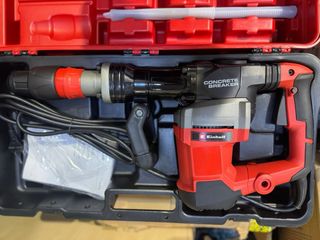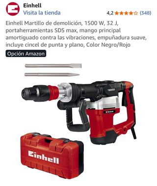 Martillo de demolición Einhell con potente motor de 1500 W y 32 J de energía de impacto. Incluye portaherramientas SDS max. - Mango principal amortiguado contra vibraciones. - Empuñadura suave para mayor comodidad. - Incluye cincel de punta y cincel plano. - Color Negro/Rojo.