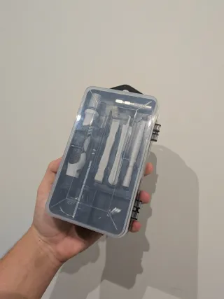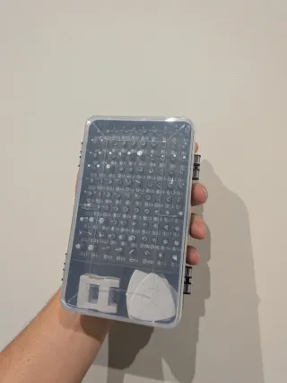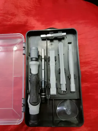 Práctica caja de herramientas con compartimentos para organizar tornillos y accesorios pequeños. Incluye herramientas de precisión y adaptadores. - Diseño compacto y portátil. - Tapa transparente para fácil visualización. - Múltiples compartimentos para organización.