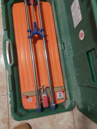 Cortadora de azulejos marca Rubi, modelo TS-60, con sistema de láser de tres luces. - Incluye maletín de transporte. - Base naranja. - Guías de corte metálicas.