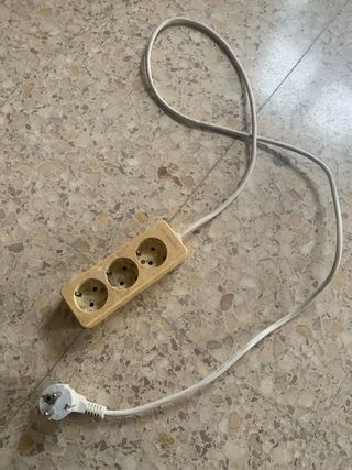Regleta de tres enchufes con cable y enchufe europeo. - Tres tomas de corriente. - Cable de alimentación. - Enchufe tipo F (Schuko).