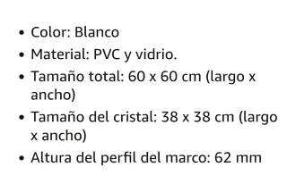Ventana con marco de PVC y cristal. - Color: Blanco - Material: PVC y vidrio. - Tamaño total: 60 x 60 cm (largo x ancho) - Tamaño del cristal: 38 x 38 cm (largo x ancho) - Altura del perfil del marco: 62 mm