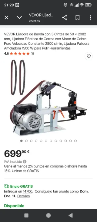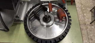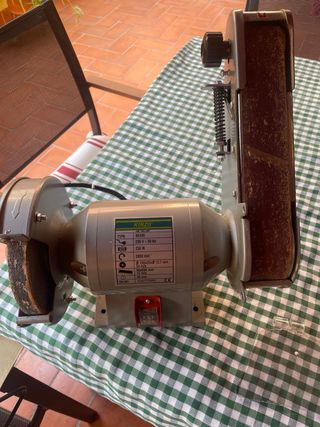 Lijadora de banda profesional ideal para trabajos de cuchillería o cualquier artesanía que requiera un lijado potente y de precisión. - Tamaño de las lijas 2000x50mm - Motor de 3hp/2.2kW monofásico - Regulador de velocidad - Posibilidad de trabajo en vertical y horizontal - Trabajo en plano o con rueda - Bandeja de apoyo - Estructura solida de hierro y pesada (por lo menos serán unos 80kg). No vibra nada al trabajar con ella - Esta en perfecto estado, la vendo por cambio de taller y formato de trabajo, si no me la quedaría. Las fotos son de hace como un año, pero está igual. Muy cuidada. Debido al tamaño, el envío no es posible