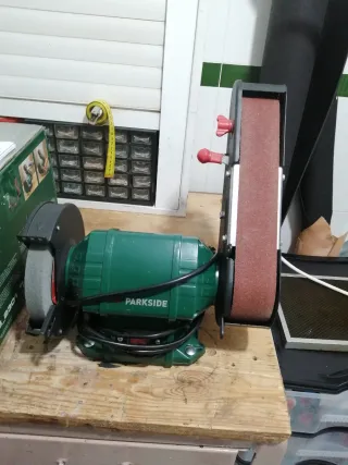 Lijadora de banda estacionaria Parkside. - Potencia de conexión: 240 W (S6 10%), 190 W (S1). - Velocidad de giro en vacío: 2980 rpm. - Velocidad de rotación del disco de amolar: 23 m/s. - Velocidad de rotación de la banda de lija: 15 m/s.