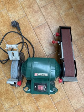 Lijadora de banda de la marca Parkside con disco de amolado, único detalle en uno de los agujeros de la base.