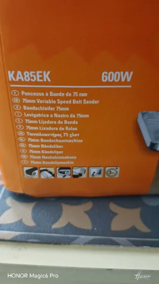 Lijadora de banda Black & Decker, modelo KA85EK, con 600W de potencia. Ideal para trabajos de lijado. - Ancho de banda de 75 mm. - Velocidad variable. - Incluye manual de instrucciones en varios idiomas.
