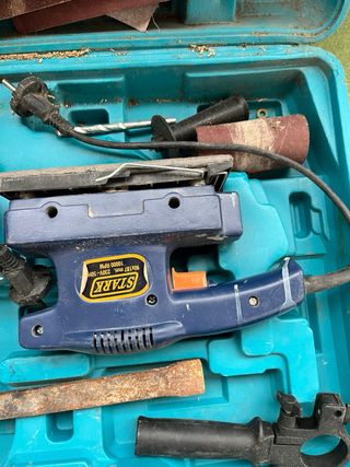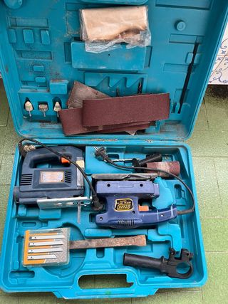 Maletín con herramientas eléctricas para bricolaje y trabajos manuales. - Incluye caladora y lijadora. - Varios accesorios de lijado y brocas. - Cuchillas de sierra para caladora. - Mango adicional para lijadora.
