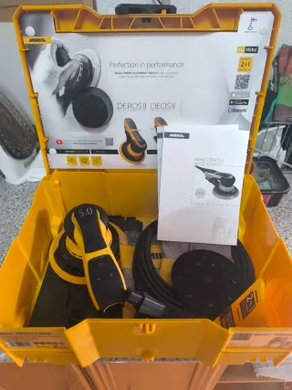 Se vende lijadora Mirka Deros en su maletín original junto con aspirador. - Lijadora eléctrica Mirka Deros. - Maletín de transporte. - Aspirador AFC-AutoFilterCleaning.