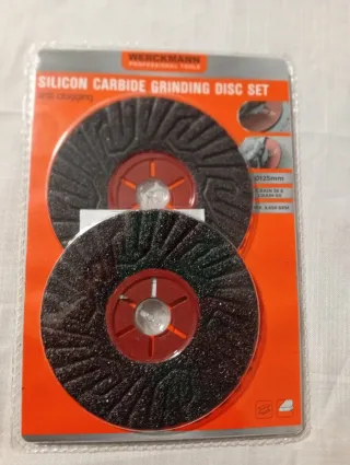 Set de dos discos de lija de carburo de silicio para lijadora. - Marca: Werckmann - Diámetro: 125mm - Granulometría: Grano 36 y Grano 60 - Máximo RPM: 9.550