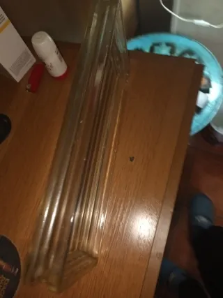 Bloque de vidrio translúcido con acabado acanalado. - Material: Vidrio. - Diseño: Rectangular con bordes redondeados. - Textura: Líneas verticales en relieve.