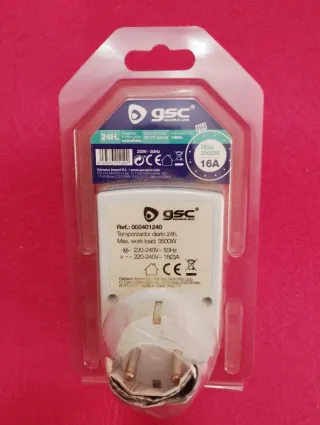 Temporizador mecánico diario de la marca GSC. Nuevo sin usar está en su envoltorio con instrucciones cerrado herméticamente. Permite programar encendidos y apagados automáticamente de aparatos eléctricos y iluminación. - Programación de 24 horas. - Enchufe y toma de corriente. - Diseño compacto.