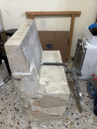 Lavadero de cemento con superficie acanalada para frotar. - Material: Cemento. - Diseño: Superficie acanalada. - Estilo: Antiguo.