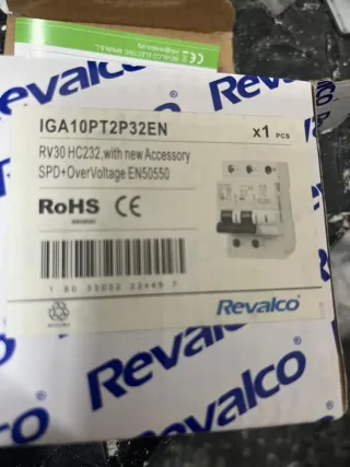 Protección contra sobretensiones Revalco modelo IGA10PT2P32EN. - Tipo: RV30 HC232 con accesorio SPD+OverVoltage. - Certificación: EN50550. - Cumple normativa RoHS y CE.