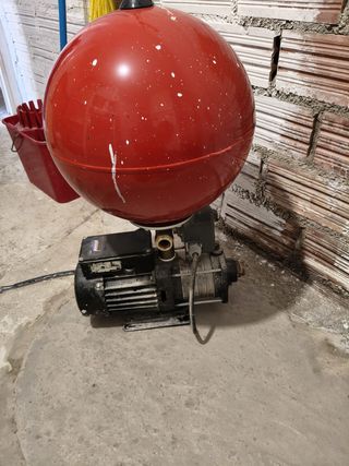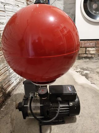 Sistema de presión para el hogar con calderín esférico. - Bomba de agua. - Calderín esférico rojo.