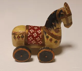 Bonito caballo de madera hecho a mano, con un diseño tradicional y ruedas para moverlo. Tiene algún desgaste en la pintura tal como se ve en las fotos. Mide 9 cm. y 11 hasta el morro, 6 cm. de alto hasta el lomo y 11 hasta las orejas. - Pintura detallada en rojo, negro y dorado. - Adornos florales en el cuerpo. - Ruedas de madera con borde naranja.