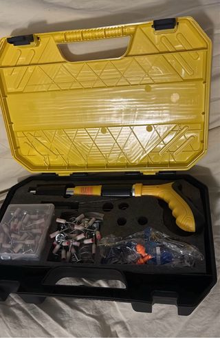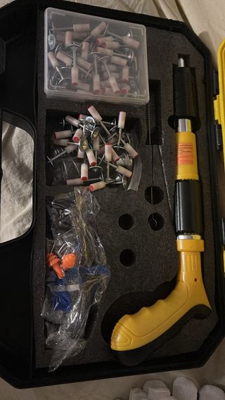 Se vende clavadora de clavos por detonación, ideal para trabajos de fijación. Incluye su maletín original y todos los accesorios. - Maletín de transporte amarillo y negro. - Clavadora con mango ergonómico. - Caja con clavos de fijación. - Bolsa con clavos de fijación.